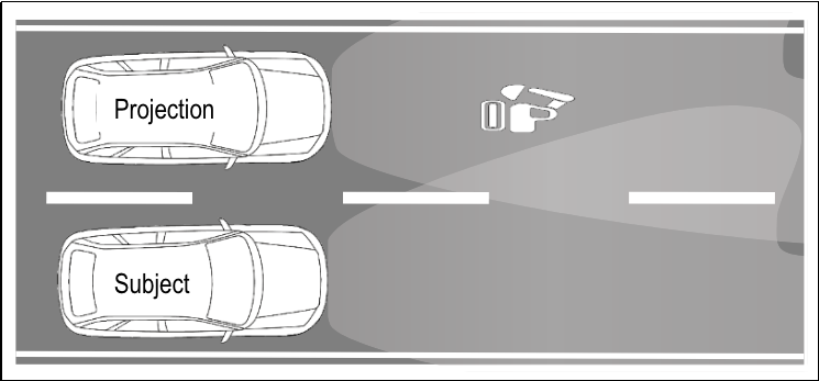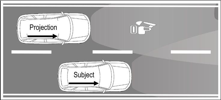 為了在動(dòng)態(tài)交通中實(shí)現(xiàn)投影的持續(xù)可見(jiàn)性,文章規(guī)定投影車(chē)輛和目標(biāo)車(chē)輛都朝同一方向行駛,制造了一種可能導(dǎo)致長(zhǎng)時(shí)間分心的情況。測(cè)試規(guī)定受試者駕駛的車(chē)輛被投影車(chē)輛超車(chē)(見(jiàn)圖1),由于可持續(xù)注視時(shí)間取決于速度差,測(cè)試車(chē)輛以100km/h(±5km/h)的恒定速度行駛,投影車(chē)輛在相鄰車(chē)道上以115km/h(±5km/h)的恒定速度超過(guò)目標(biāo)車(chē)輛,平均速度差約為15km/h。