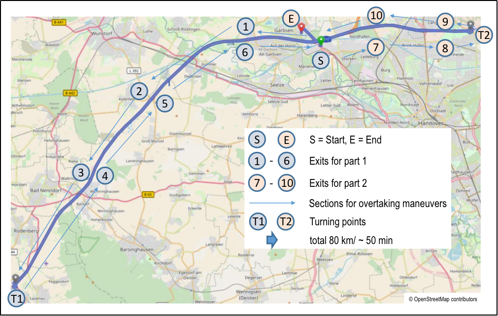 這項(xiàng)研究在傍晚的德國(guó)高速公路上進(jìn)行(見(jiàn)圖3),該高速公路段限速為120km/h,最大環(huán)境照度約為0.3lx,以確??梢郧宄乜吹酵队?。圖3中點(diǎn)①、③、④、⑥為服務(wù)區(qū)。點(diǎn)②和⑤是高速公路出口。測(cè)試時(shí)投影車(chē)輛可以通過(guò)這六個(gè)位置進(jìn)入測(cè)試道路完成超車(chē)動(dòng)作后離開(kāi),以便在不被受試者發(fā)現(xiàn)的情況下駛?cè)霚y(cè)試車(chē)輛的后方。對(duì)于每個(gè)第一部分的道路測(cè)試,圖案投影狀態(tài)隨機(jī)生成(“關(guān)閉”、“靜態(tài)”、“動(dòng)態(tài)”,動(dòng)態(tài)投影頻率1Hz,暗光時(shí)間為0.5s)。針對(duì)第一部分的測(cè)試在點(diǎn)⑥處結(jié)束。