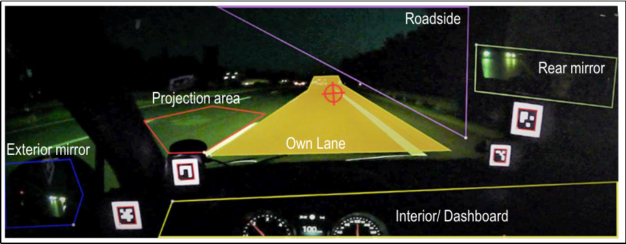目前,美國(guó)、歐盟和中國(guó)等許多國(guó)家都有一些車(chē)輛會(huì)提供道路投影的功能,主要包括投射路線,比如道路場(chǎng)景中的引導(dǎo)線、符號(hào);車(chē)道偏離預(yù)警;以及啟動(dòng)車(chē)輛時(shí)的燈光顯示等。當(dāng)?shù)缆吠队坝糜谂c駕駛員或其他道路使用者進(jìn)行有針對(duì)性溝通時(shí),該投影可能會(huì)導(dǎo)致其他交通參與者出現(xiàn)分心,從而出現(xiàn)交通安全隱患。因?yàn)閷?shí)際的道路交通中人們能夠感知潛在的危險(xiǎn),甚至是外圍的危險(xiǎn)——其他車(chē)輛駕駛員的投影可能會(huì)落在相應(yīng)的視野范圍內(nèi),因此會(huì)導(dǎo)致明顯的分心,從而使交通安全存在隱患[2]。
