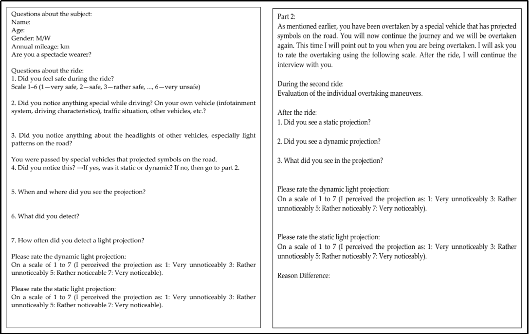 接下來(lái)是第二部分測(cè)試,在該部分中,受試者被告知研究目的并了解投影車(chē)輛。之后測(cè)試車(chē)輛繼續(xù)經(jīng)歷了四次被超車(chē)的情況(如圖3中的橙色點(diǎn)⑦-⑩),在這四次超車(chē)中,受試者被靜態(tài)和動(dòng)態(tài)投射交替超車(chē),以相互比較這兩種投射類型。為了確保投影圖案能被看到,每次的超車(chē)受試者會(huì)被提前告知。