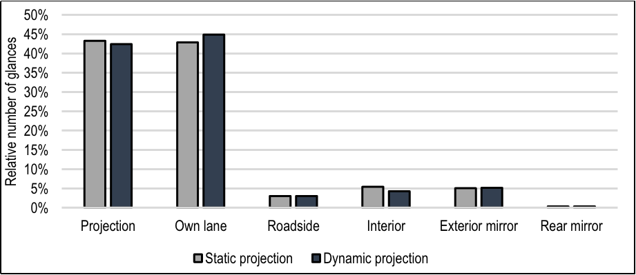 Glück等人研究了當(dāng)?shù)缆飞系耐队坝糜谂c投射車(chē)輛的駕駛員溝通時(shí),該投影對(duì)其他交通參與者所產(chǎn)生分心的影響。文章通過(guò)對(duì)測(cè)試和問(wèn)卷的結(jié)果分析,得出對(duì)于所研究的場(chǎng)景具有選定圖案形狀和亮度的道路投影,視覺(jué)吸引力較低,并且當(dāng)直接觀察投影時(shí),幾乎沒(méi)有發(fā)生信息通過(guò)投影傳遞給其他交通參與者,所以不會(huì)導(dǎo)致嚴(yán)重的分心。