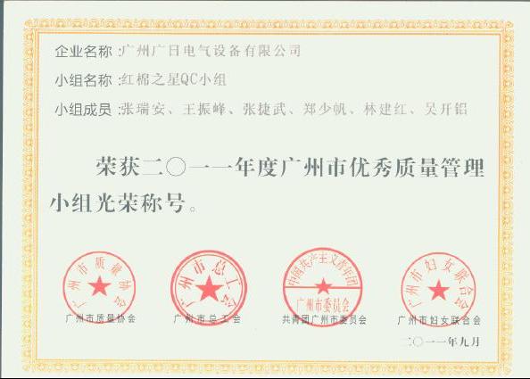 近日,我司質(zhì)量QC小組勇創(chuàng)佳績(jī),其中“質(zhì)檢 QC小組”和“紅棉之星QC小組”榮獲2011年度“廣州市優(yōu)秀質(zhì)量管理小組”的榮譽(yù)稱號(hào)。