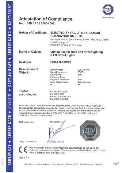 2013年8月26日,我司自主研發(fā)的飄逸路燈(型號(hào):EFG-LD-35W13)獲得由德國南德意志(TUV-SUD)頒發(fā)的CE認(rèn)證,意味著我司此項(xiàng)產(chǎn)品取得了進(jìn)入歐洲市場的資格。