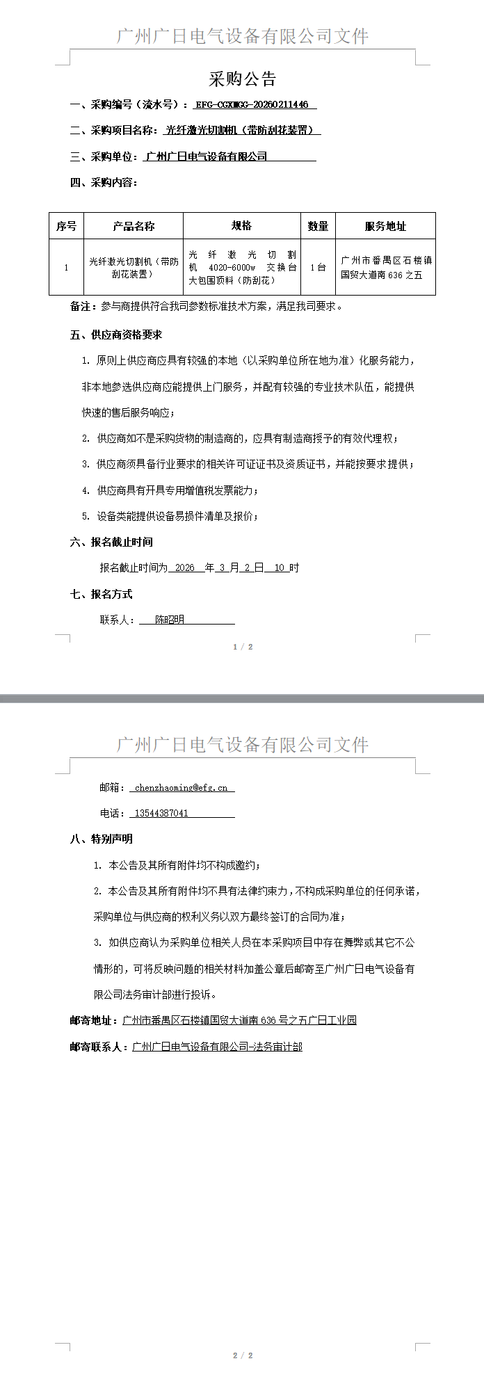 光纖激光切割機(jī)(帶防刮花裝置)采購(gòu)