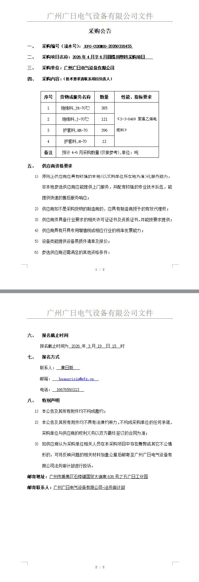 2026年4月至6月圓纜用塑料采購(gòu)項(xiàng)目